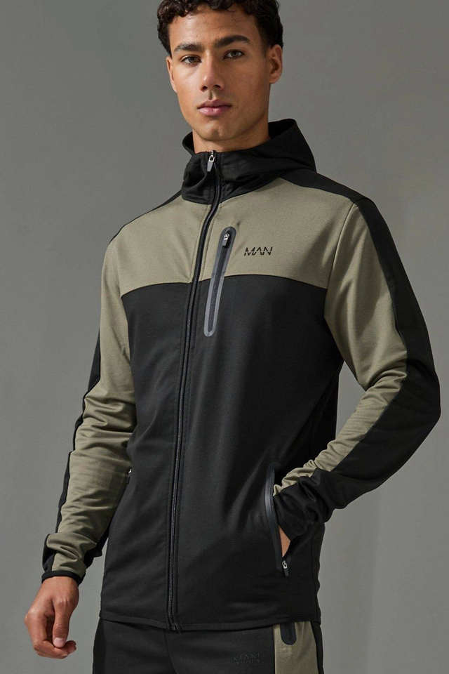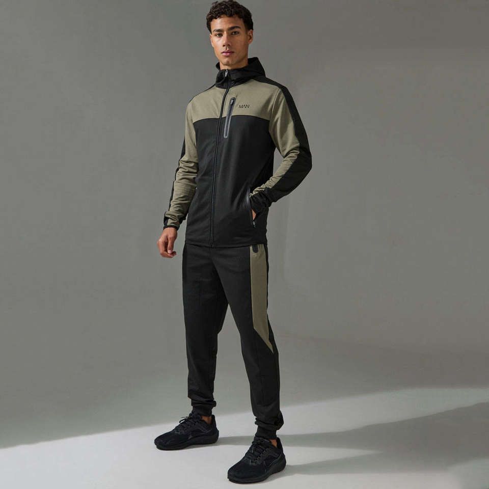OEM Custom New Design Khaki Active Colour Block Funnel Tracksuit Nylon Lightweight Two Piece Track Jacket & Pant Men Sweatsuits