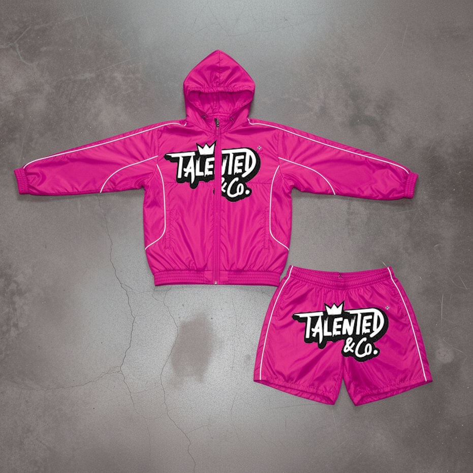 OEM Custom Reflective Hooded Solid Spring Two-Piece Short Sweatsuit Spandex/Polyester Windbreaker Jacket & Short Set Unisex