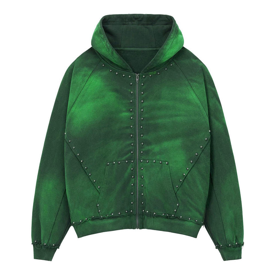 OEM Custom Sunfaded Zipper Fleece Streetwear Functional Acid Wash Men Rivet Heavyweight Rhinestone Oversized 100% Cotton Autumn