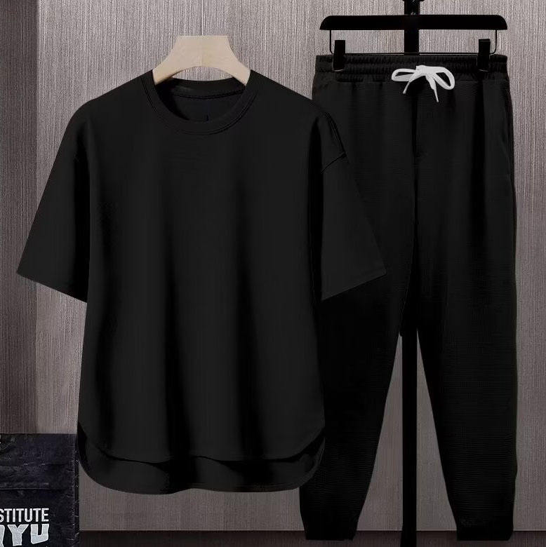 OEM Custom logo Embroidery Printed Design Loose Suits Solid Color Men's T-shirts Summer Short-sleeved Trousers Two-piece Suit