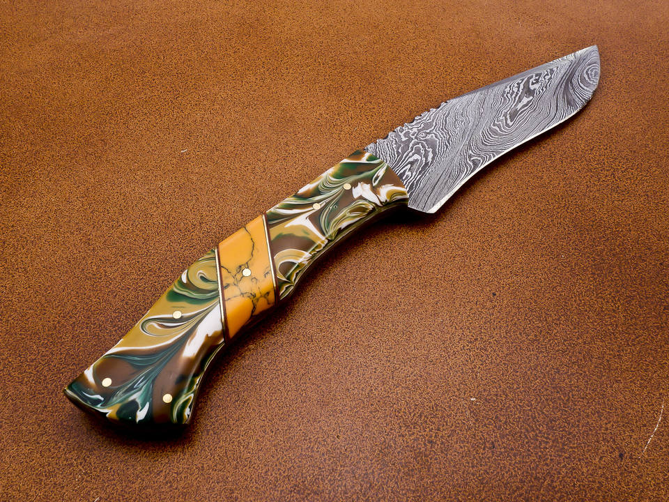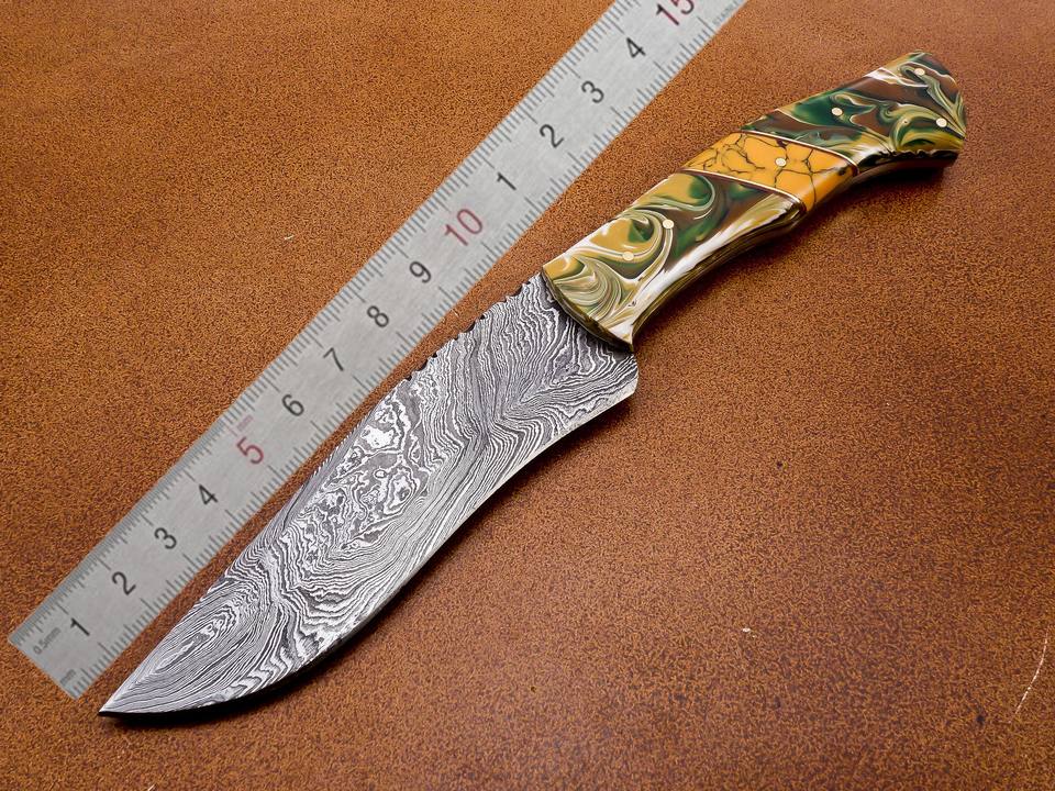 OEM Customizable Damascus Steel Hunting Knife Handmade Resin Handle Wood Horn Material Twisted Pattern Leather Sheath for EDC