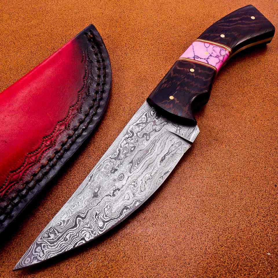 OEM Customizable Damascus Steel Skinner Knife wood Handle Twisted Pattern Leather