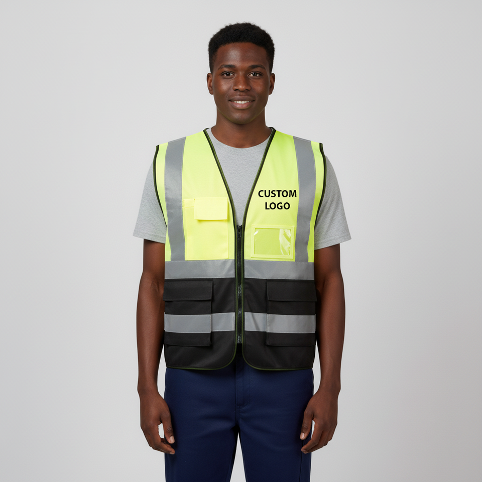 OEM Customized Logo Mesh 4 Pockets Multifunctional ANSI Class 2 Waterproof LED Flash Reflective Fluorescent Yellow Black Safety