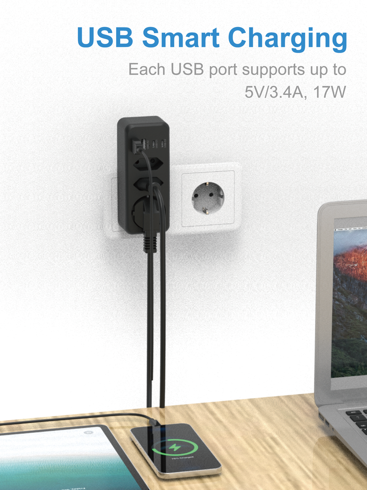 OEM Customized Wall Tap Schuko 2 Pin Plug Insert 3 Way Extension Socket Adapter with USB a and Type-C Ports 3 Outlets