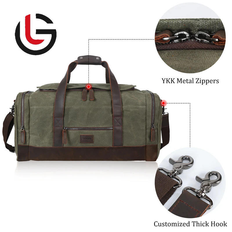 OEM Genuine Leather Trip Travel Bag 3 Compartment Front Pocket Waxed Cotton Light Weight Canvas Waterproof Shoe Compartment for