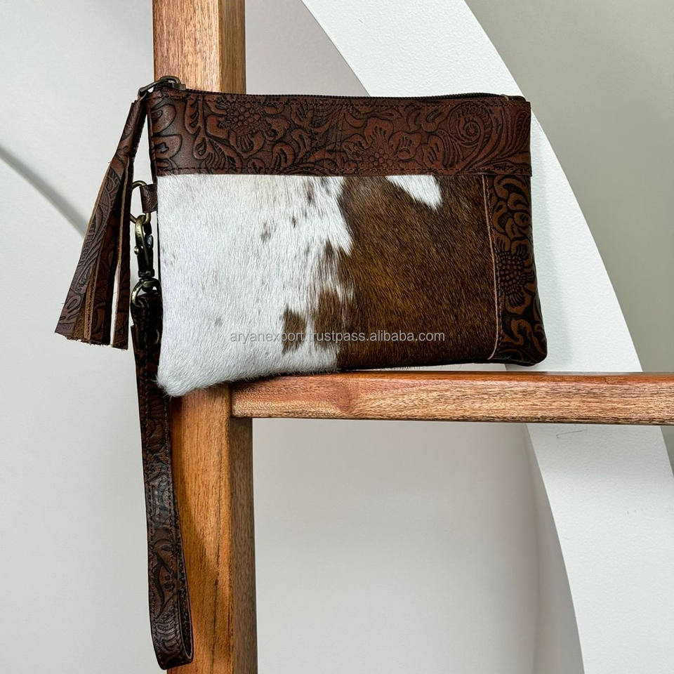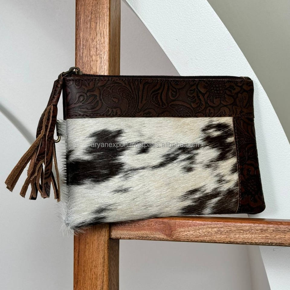 OEM Hair on Cowhide Embossed Leather Wristlet & Tassel Pouch Premium Quality Handmade Floral Leather Western Ladies Purse Wallet