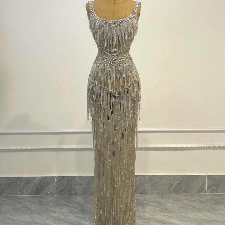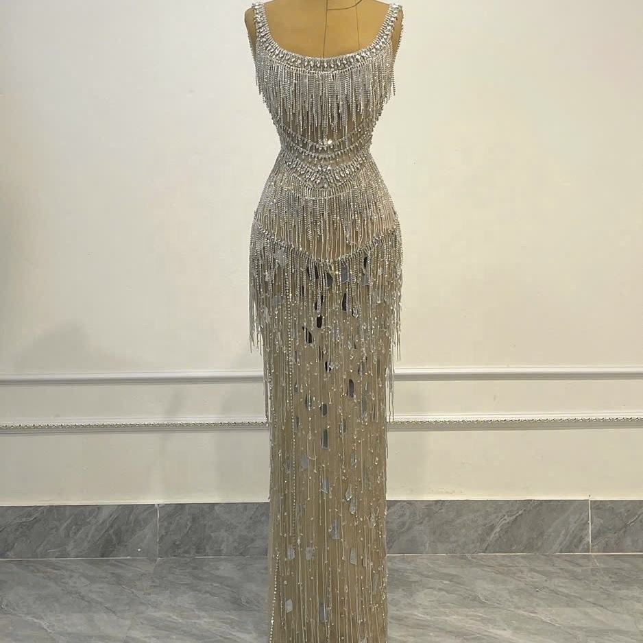 OEM Luxury Silver Mermaid Evening Dress Handmade Modern Crystal Beading New Design TNBP for Mother Bride Decorated Flowers Lace