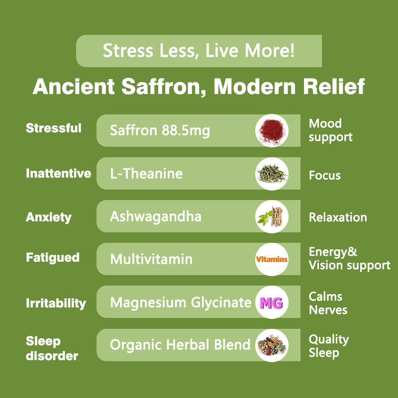 Main Ingredient:Saffron Extract, Ashwagandha Root Extract, L-Theanine, Magnesium, Vitamin D3, Vitamin B12, Turmeric, Organic Herbal Blend
