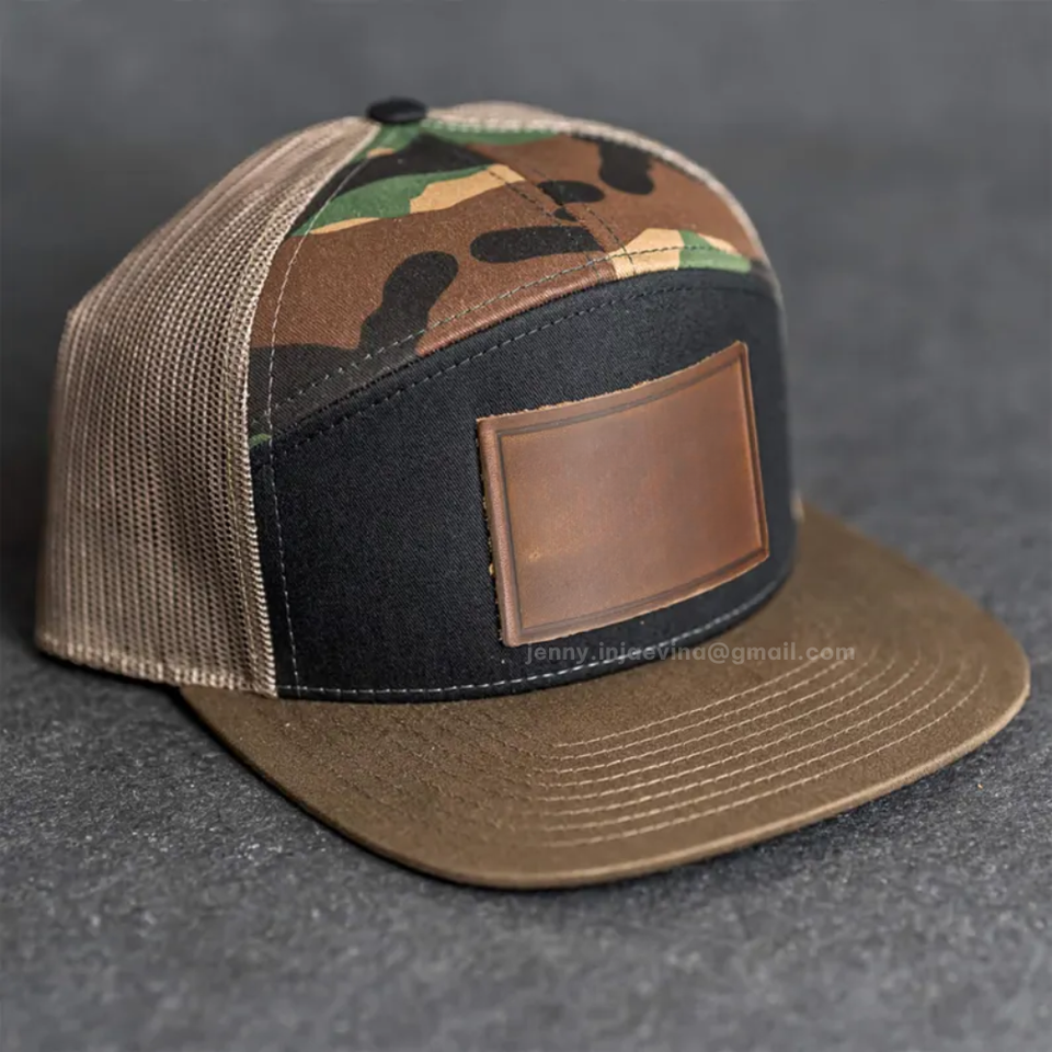 OEM High Quality 7 Panel Camo Trucker Hats Custom Logo Patch Flat Brim Snapback Cap Lightweight Mesh Back Gorras Vietnam Factory