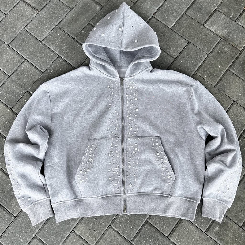 OEM Manufacturer Double Waisted Baggy Stacked Pants Sweat Suits 2 Piece Set pearl Rhinestone Flare Sweatpants and hoodie Sets