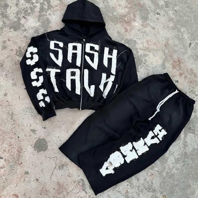 OEM Men's Custom Distressed Embroidery Washed Zip Up Hooded Set Straight Leg wasted Sweatpants Tracksuit Sweat suit for Winter