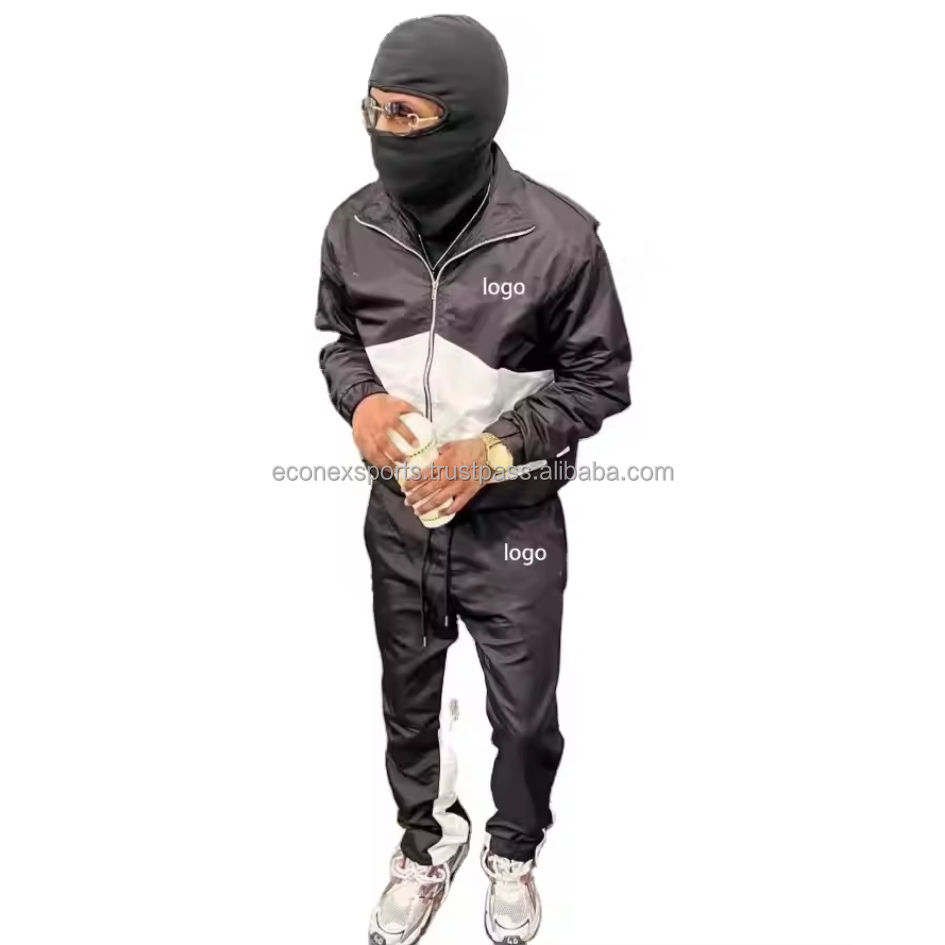 OEM Men's Custom Logo Eco-Friendly Two-Piece Set Solid Nylon Windproof Breathable Jacket Flared Sweatpants Jogger Pants Plus
