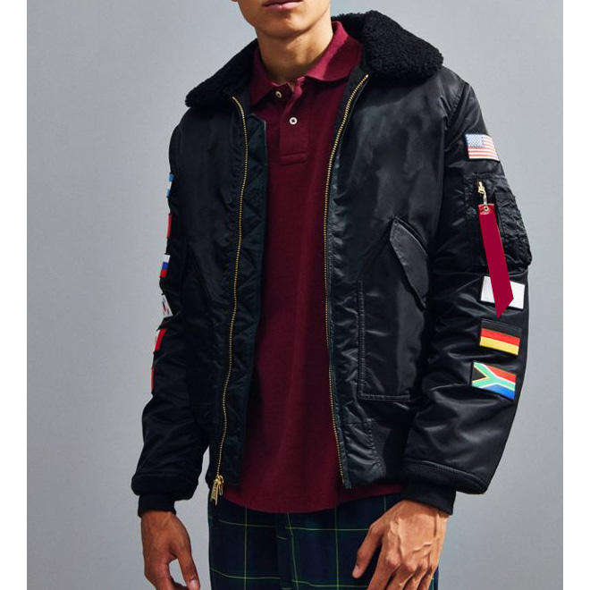 OEM Men's Varsity Jacket Stand Vintage Clothes Custom Embroidered flags satin silk fur collar Baseball Bomber jacket for men
