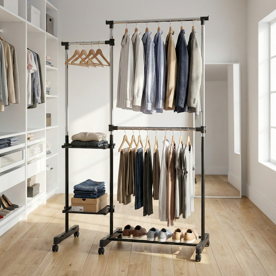 OEM Modern Eco-Friendly Floor Type Double Metal Chrome Clothes Display Racks Home Storage Organizer Series