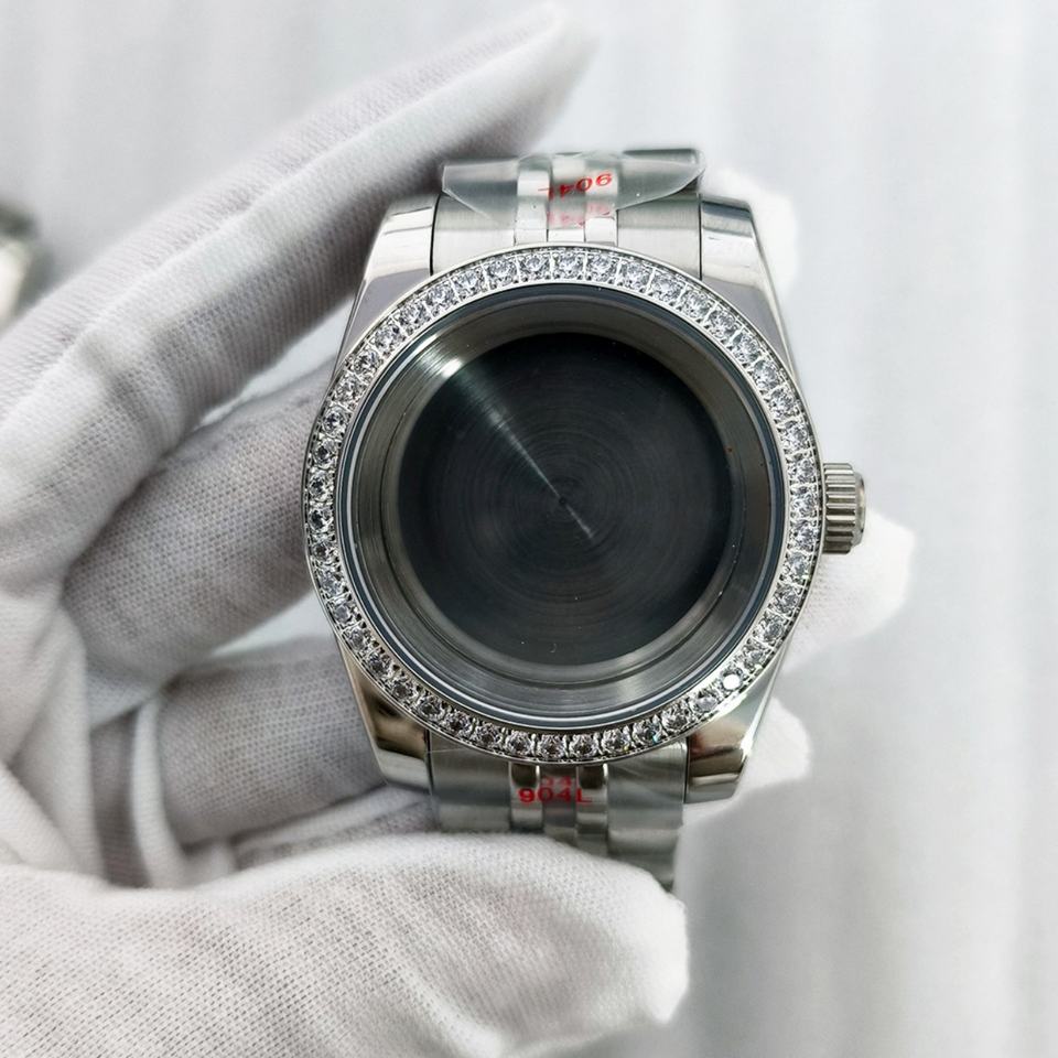 OEM ODM 36/39mm Silver Diamond Bezel Stainless Steel Watch Case Waterproof Dense Bottom Calendar Strap Custom Logo for NH35/36