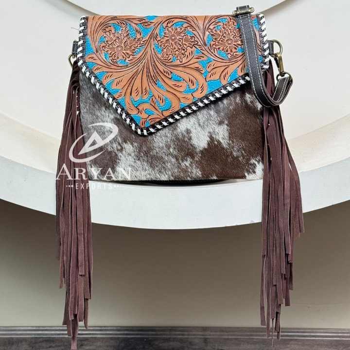 Hand Tooled Cowhide Leather Fringe Crossbody Bag
