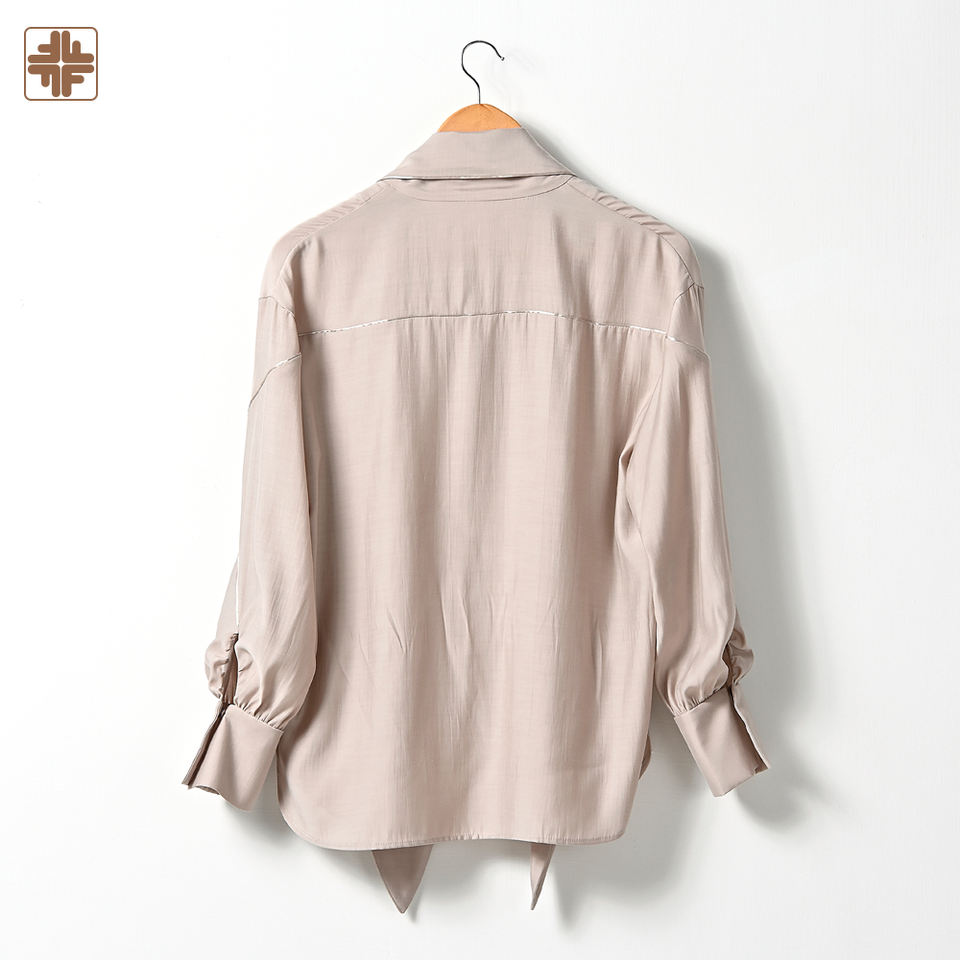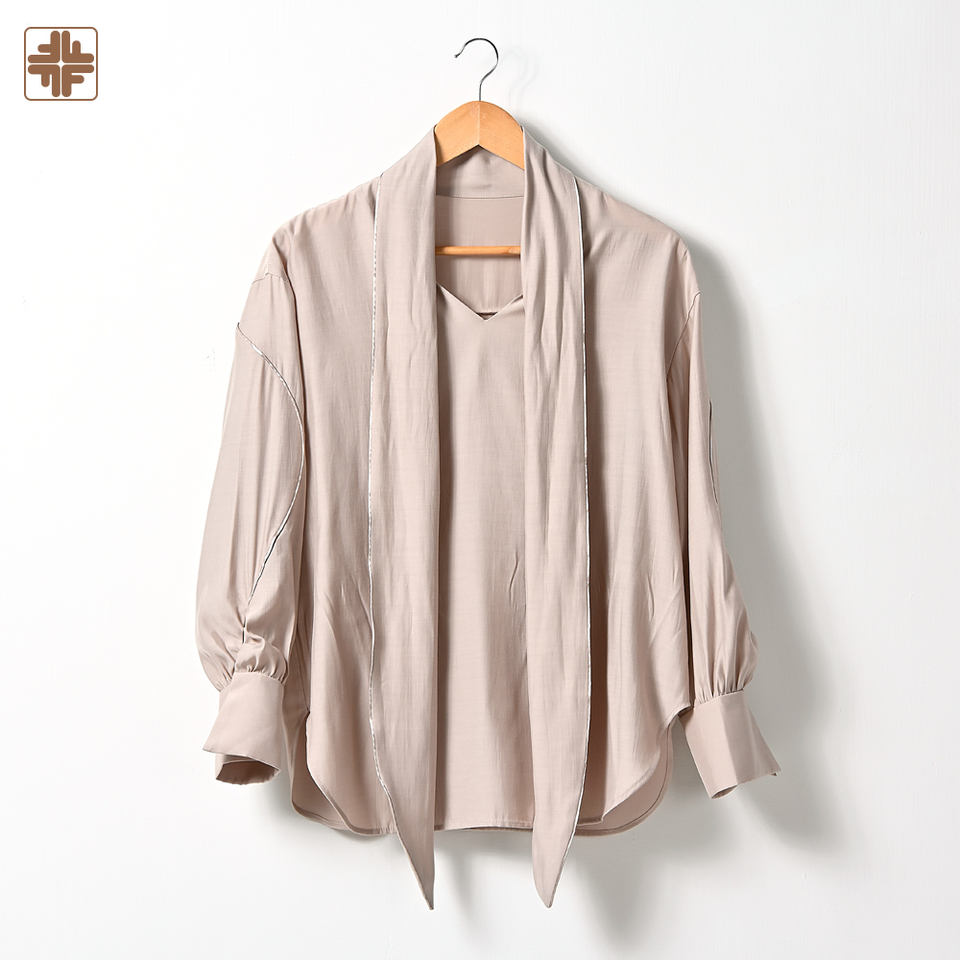 OEM ODM Eco-friendly Recycled Knitted Women's Wide Shirt with Bow Tie V-neck Breathable Blouse for Autumn/Spring Office
