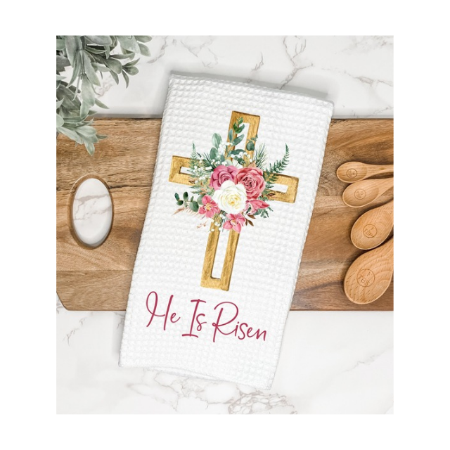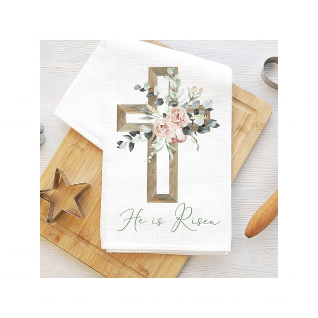 OEM ODM Floral He Is Risen Christ 100% Cotton Embroidered 17x27 Inch 180 GSM Hanging Loop Soft New Absorbent Golf Kitchen Towels