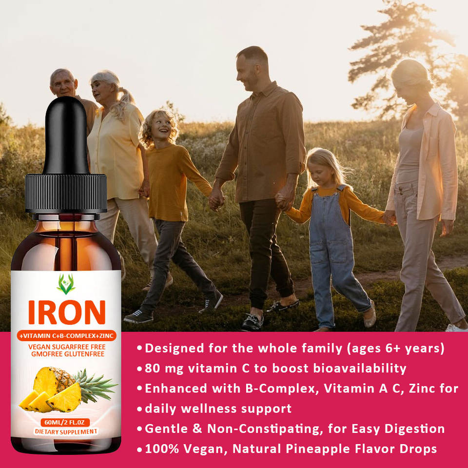 OEM ODM Iron Liquid Drops Vitamin B6 & C Zinc Folate 100% Natural Organic Immune Health Supplement 60ml for Adults Men and Women