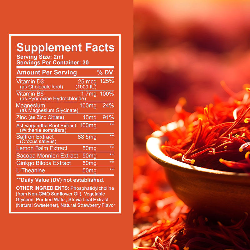 Main Ingredient:Vitamin D3, Vitamin B6, Magnesium, Zinc, Ashwagandha Root Extract, Saffron Extract, Lemon Balm Extract, Bacopa Monnieri Extract, Ginkgo Biloba Extract, L-Theanine