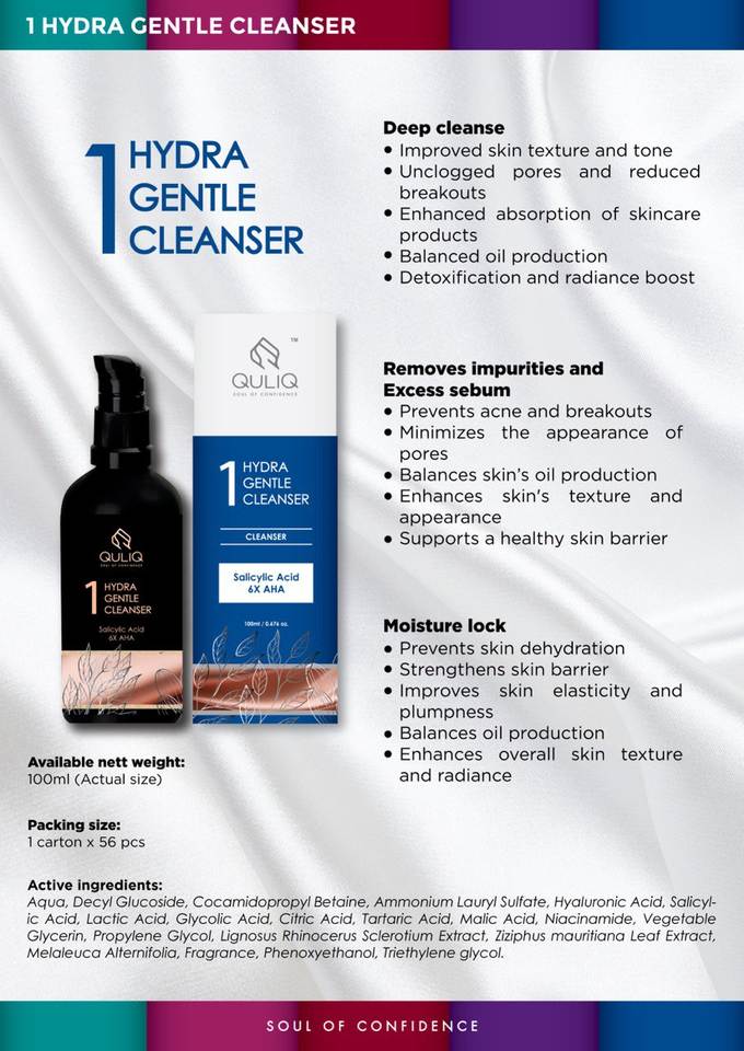 OEM/ODM Liquid Quliq Hydra Gentle Cleanser for All Skin Types Lightening Whitening Beauty Skincare for Glycerin Hyaluronic Acid