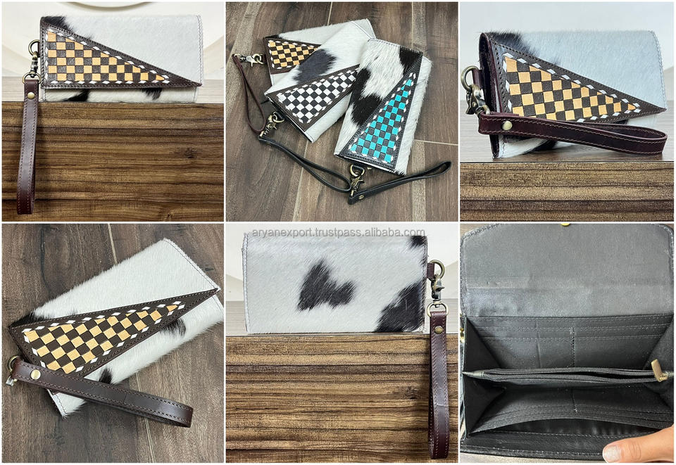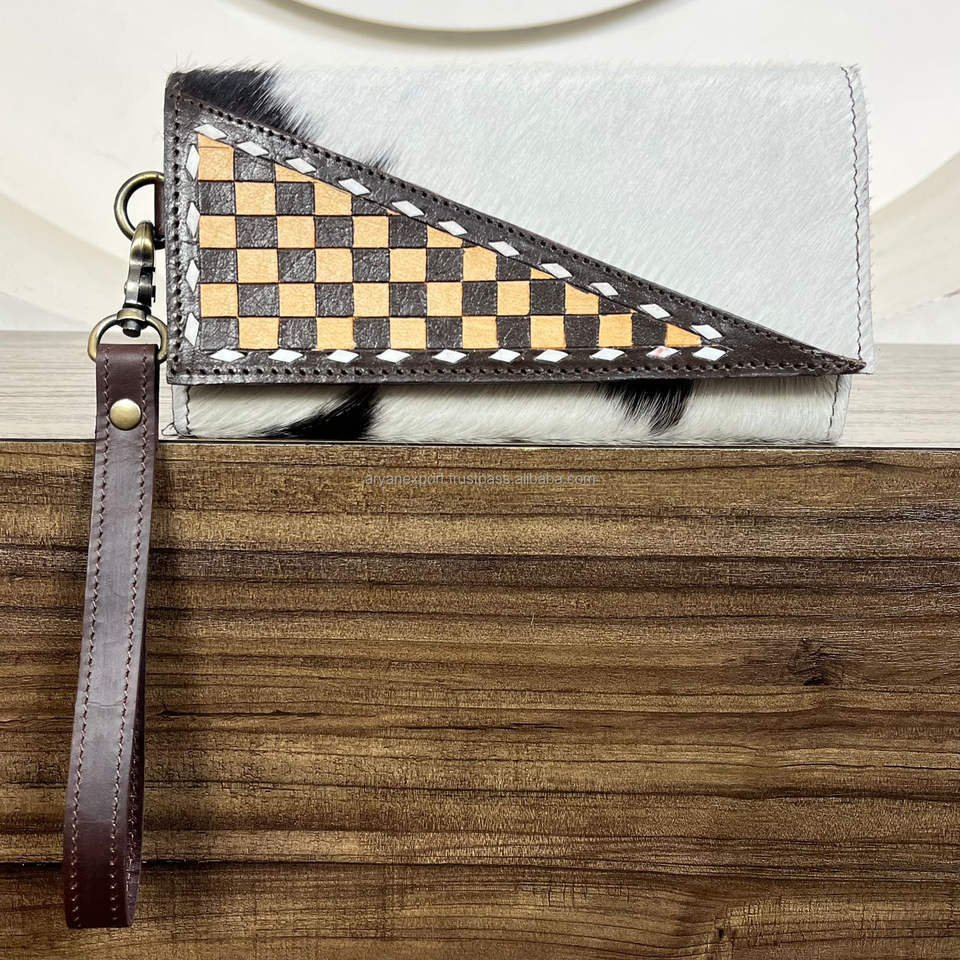 OEM ODM Luxury New Checkered Pattern Hand Tooled Cowhide Leather Woman Clutch Luxury Genuine Leather Card Holder Wristlet Wallet
