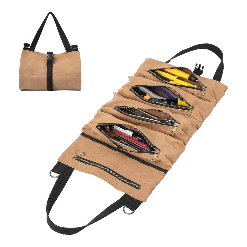 Waxed Canvas Tool Roll 5 Zipper Pocket Organizer with Buckle Closure