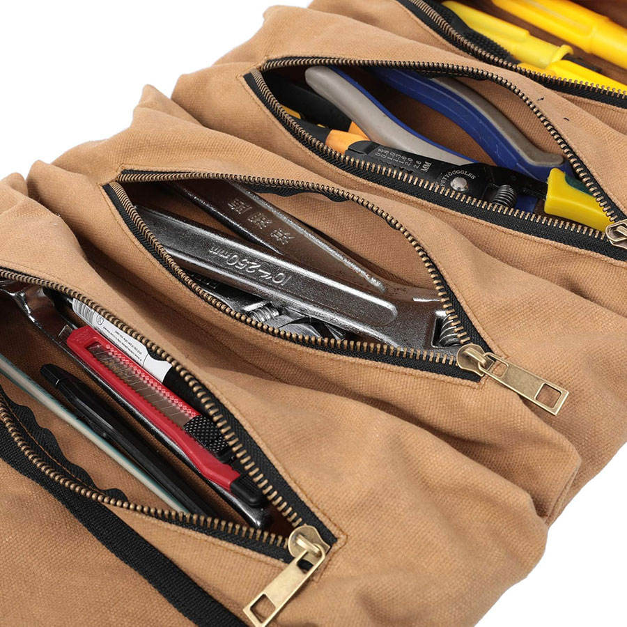 OEM/ODM Portable Premium Durable Water Resistant Waxed Canvas Tool Roll 5 Zipper Pockets Organizer Adjustable Strap