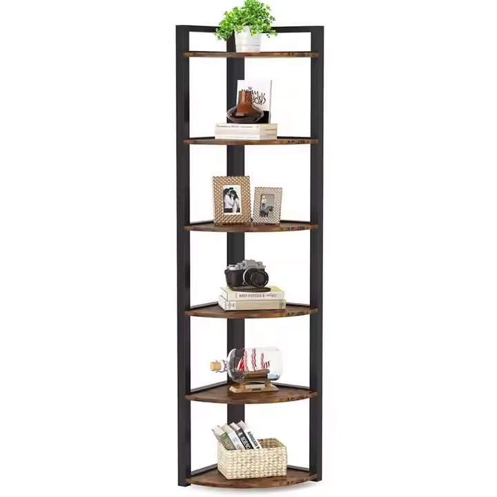OEM & ODM Spine Shaped 6-Tier Wood Metal Strong Load-Bearing Storage Bookcase Stand-Alone Display Rack for Living Room Corner