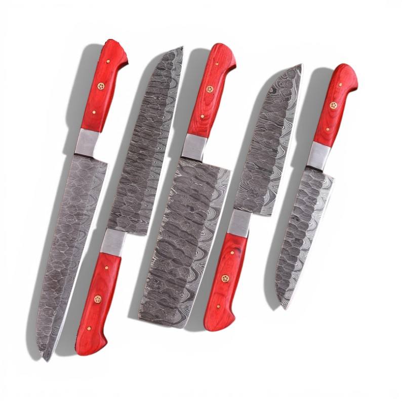 OEM/ODM Support Customized Damascus Steel 5 Pcs Handmade Chef Knives Set Pakka Wood Handles 58 HRC Razor Sharp