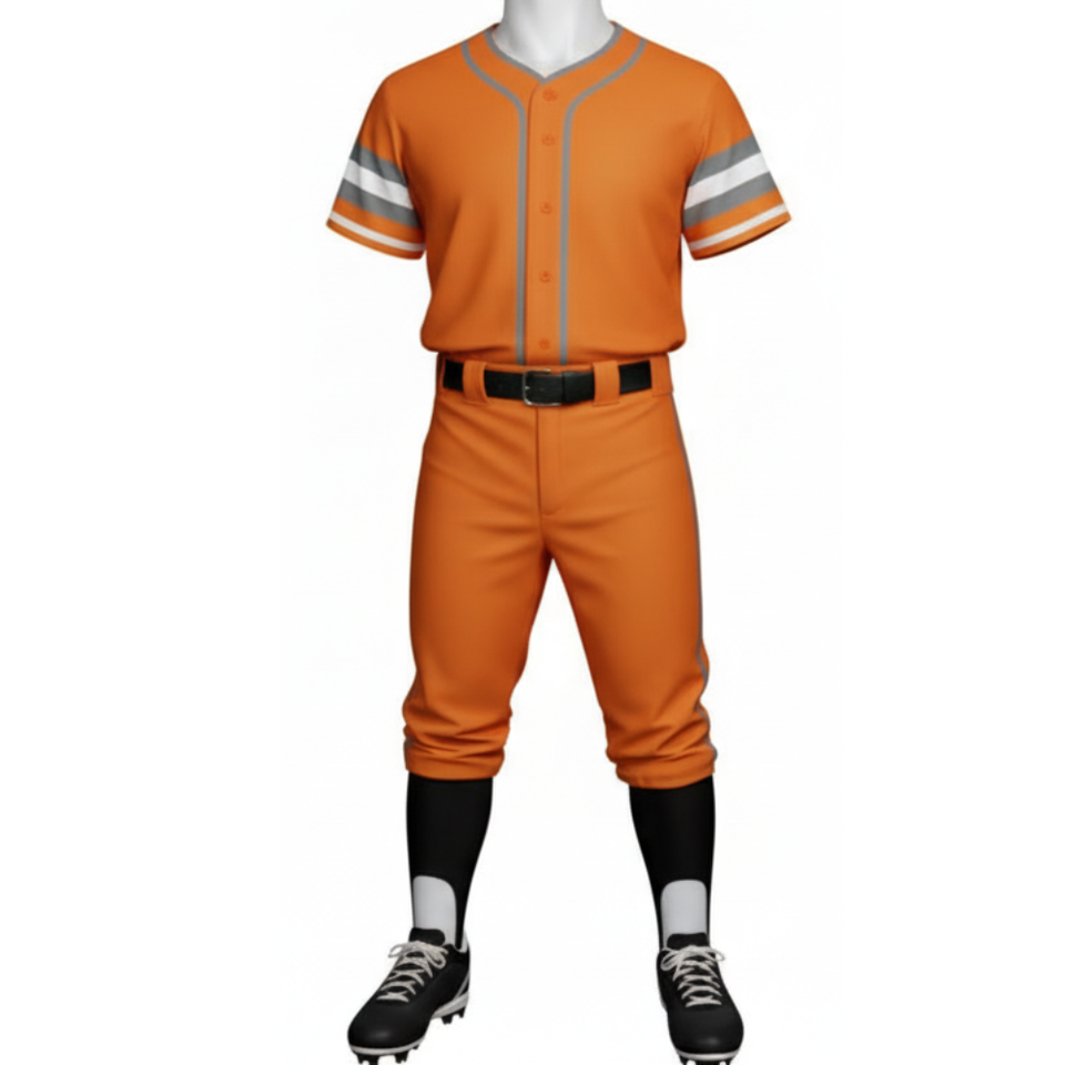 OEM Orange Performance Baseball Uniform Set Full-Button Team Jersey with Striped Sleeve Accents and Matching Athletic Pant