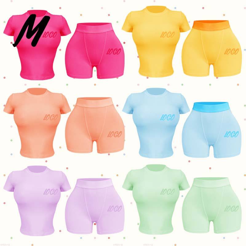 OEM Spring Color Ribbed Loungewear Women Sets Summer T Shirt and Shorts Set Custom Logo Two Piece Set Clothing for Women