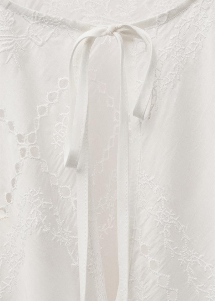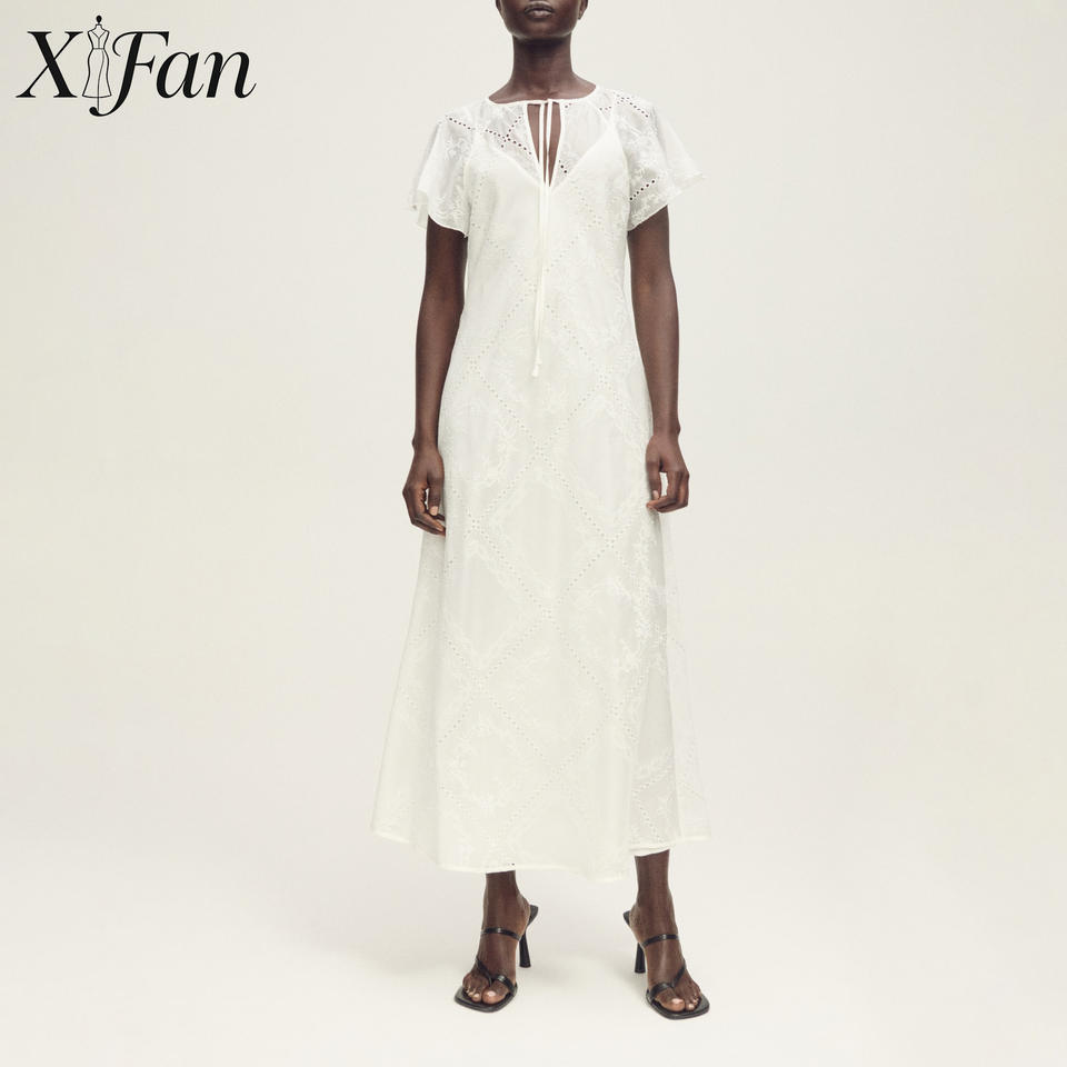 OEM Summer Elegant White Front-Tie Flowing Ladies Long Dress Casual V-neck Eyelet Embroidery Short Sleeve Midi Dress for Women