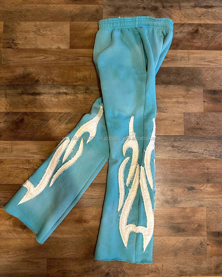 OEM Vintage Distressed Embroidery Patch Trousers 100% Cotton Streetwear Casual Sun Fade Baggy Applique Acid Wash Flared Pants