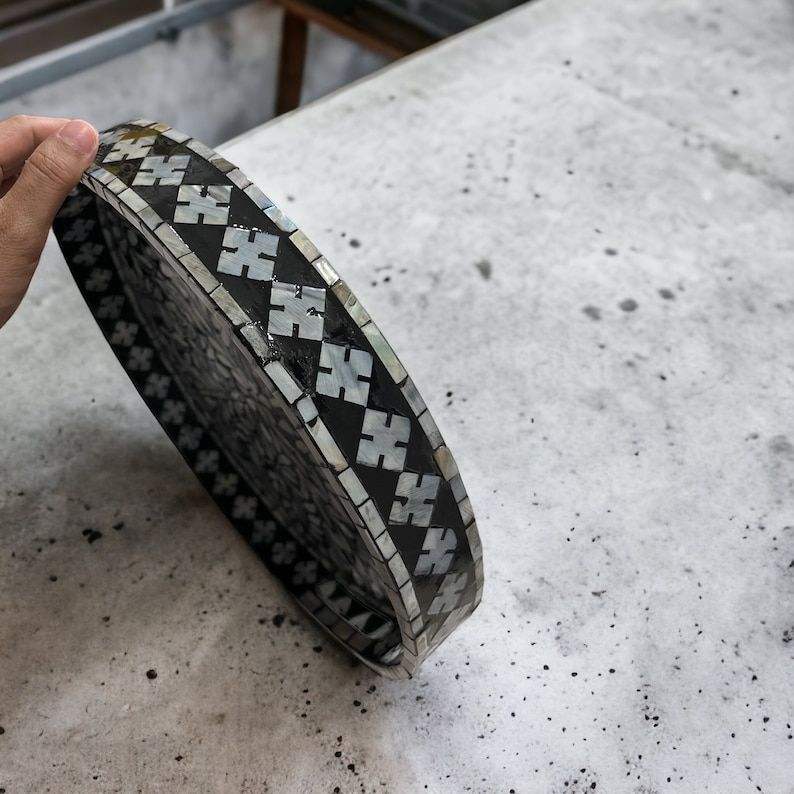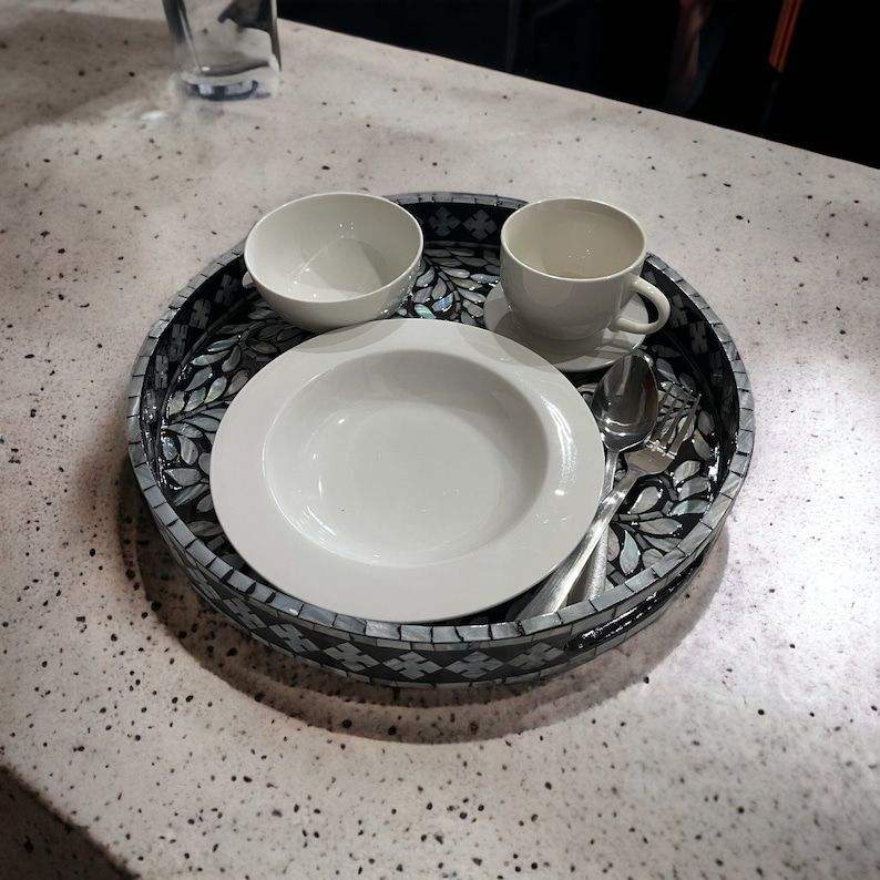 OEM Wholesale Indian-Inspired Handmade Serving Tray Mother Pearl Inlay Wood Marble Handle Trending Table Wares for Restaurant