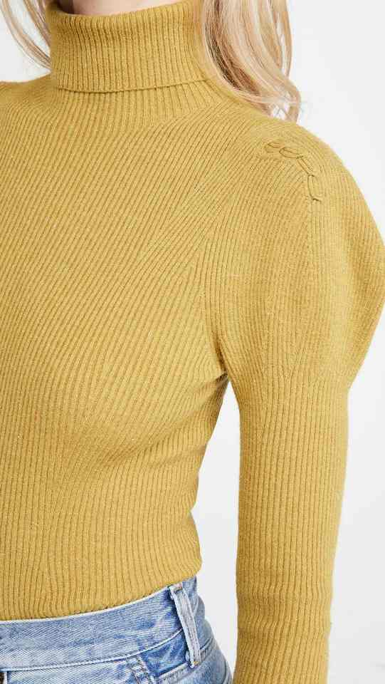 OEM Women's Casual Turtleneck Knitted Sweater with Puffed Sleeve Winter Cotton Knitwear New Design with Front Logo Appliques