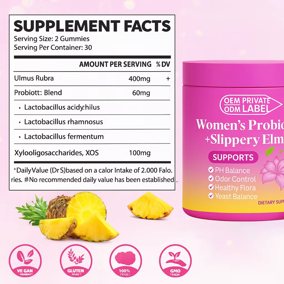OEM Women's Probiotic + Slippery Elm Cranberry Flavored Gummy Candy for pH Balance & Feminine Health 60 Gummies Effective