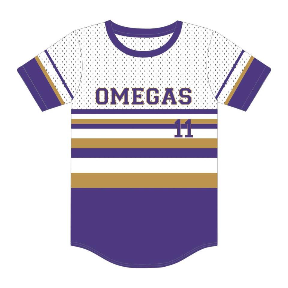 OPP Striped Design Pullover Baseball Jersey 100% Polyester Mesh Omega Fraternity T Shirt with Custom Embroidered Applique Logo