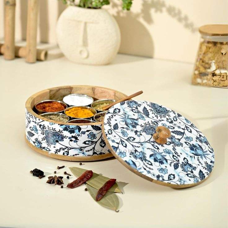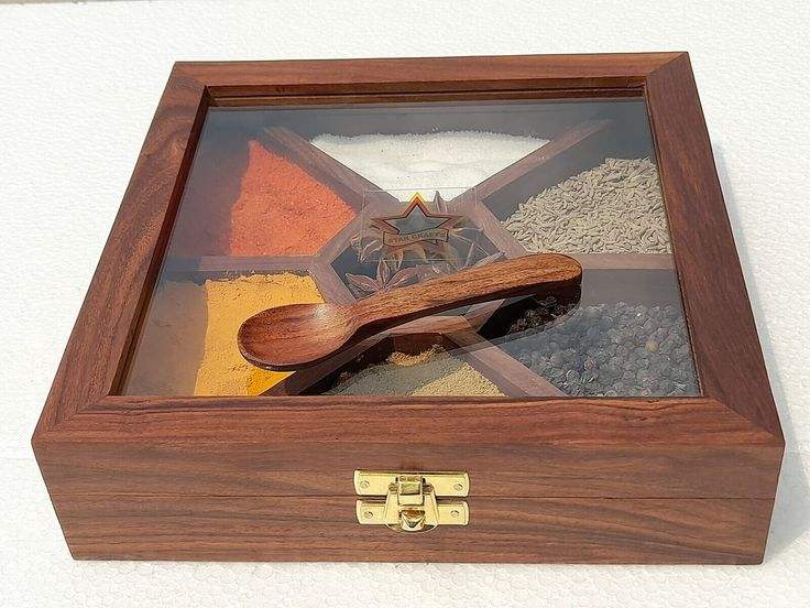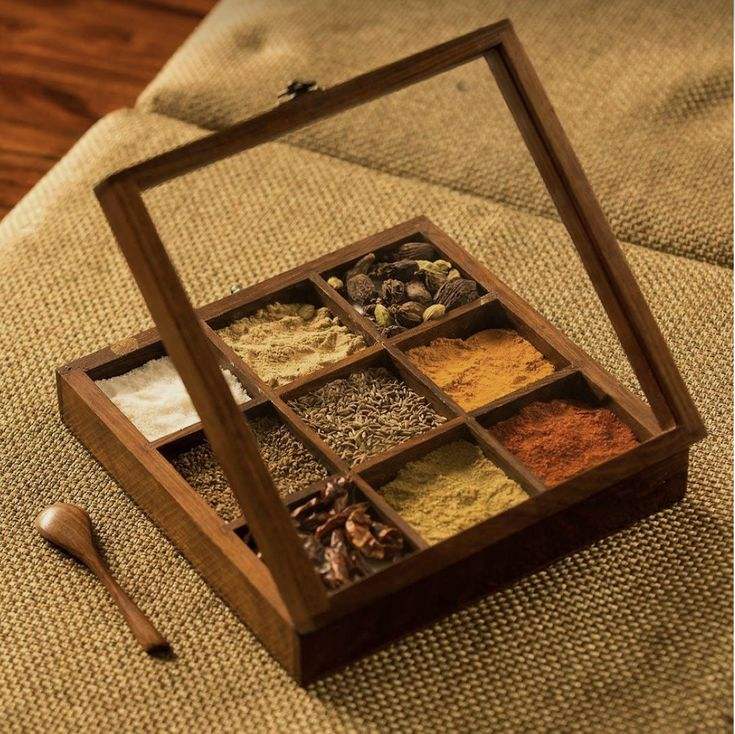 ORGANIZER NATURAL WOODEN Premium Printed Home Wooden Tabletop Spice Box With Separate Compartments for Spices and Dry Fruit Box