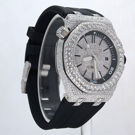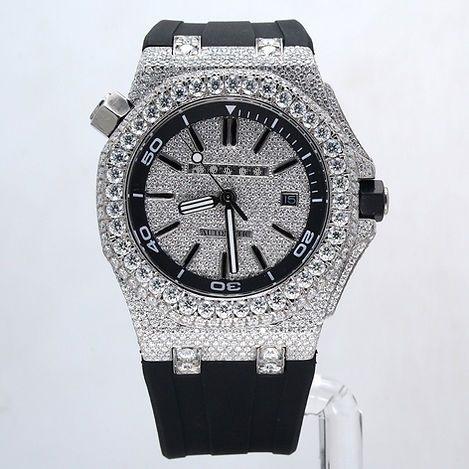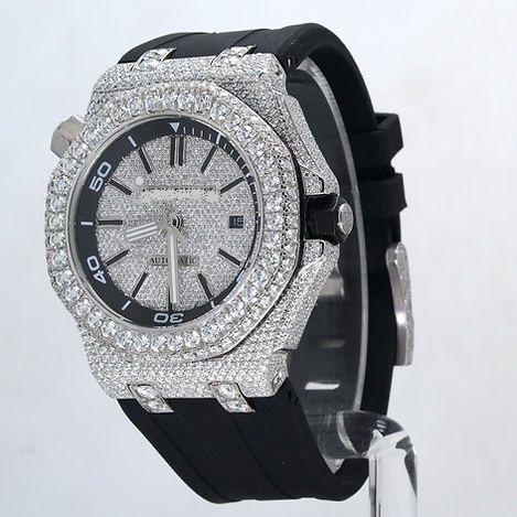 VVS Moissanite Diamond Auto Date Watch Stainless Steel Case Mechanical Movement Rubber Strap Unisex Luxury Glass