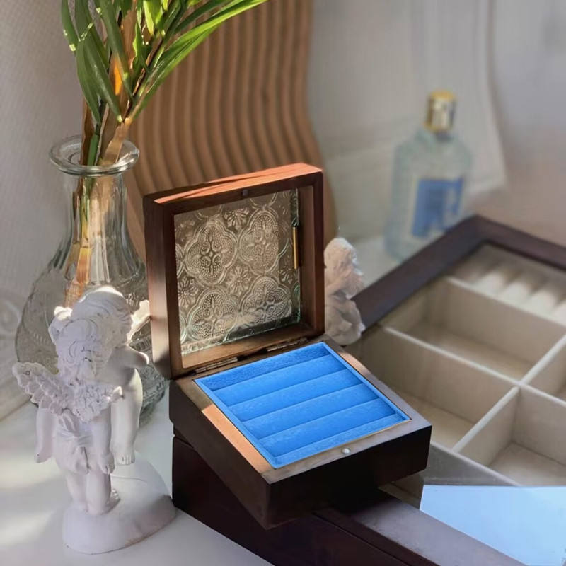 Oak Wood Walnut Color Rings Storage Organizer Box with Real Glass Pattern On Window Ready to Ship In Stock