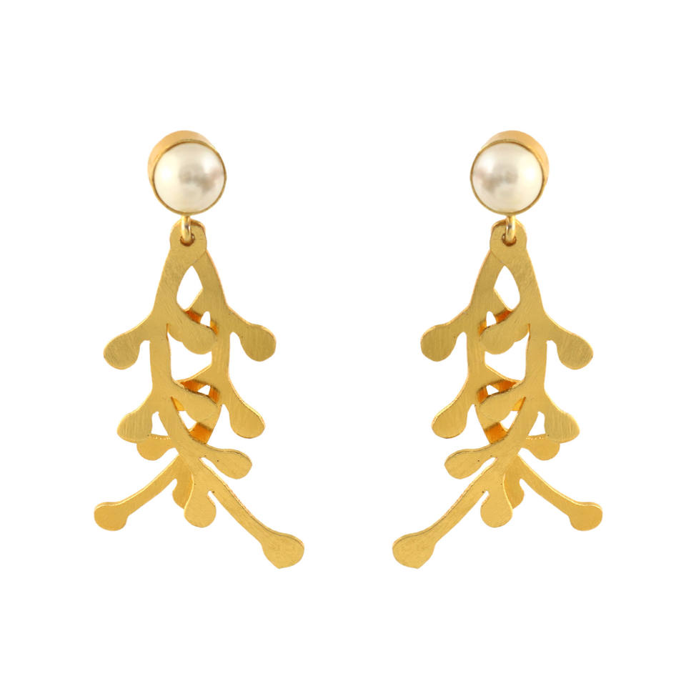 Ocean Style 18K Gold plated brass Beach Waterproof Ribbed Conch Hammer Coral Charm Earrings with cute white pearl for wholesale
