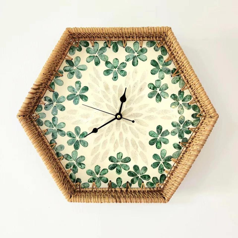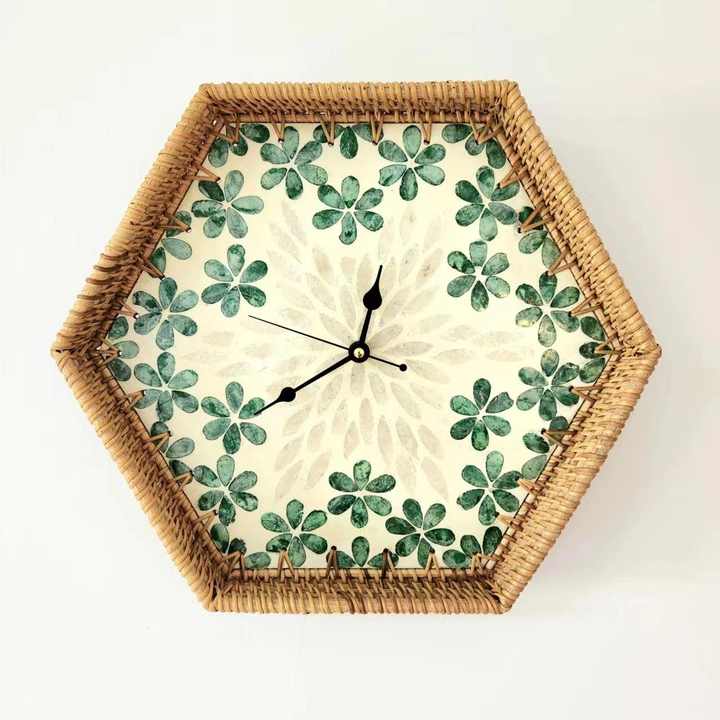 Octagon-shaped rattan clocks great deal eco friendly clock frame with shell inlay for home decor