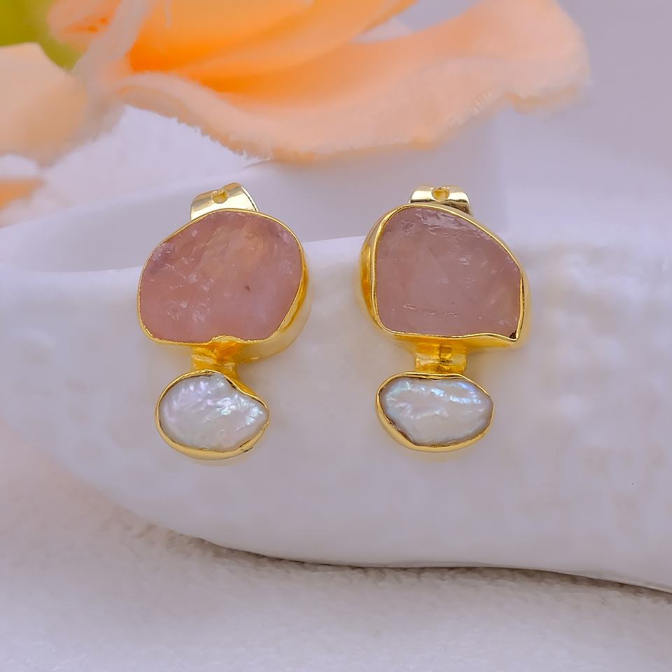 October Birthstone Rose Quartz with Pearl Stud Earrings Gold Plated Brass Channel Set Raw Trendy Women's Jewelry