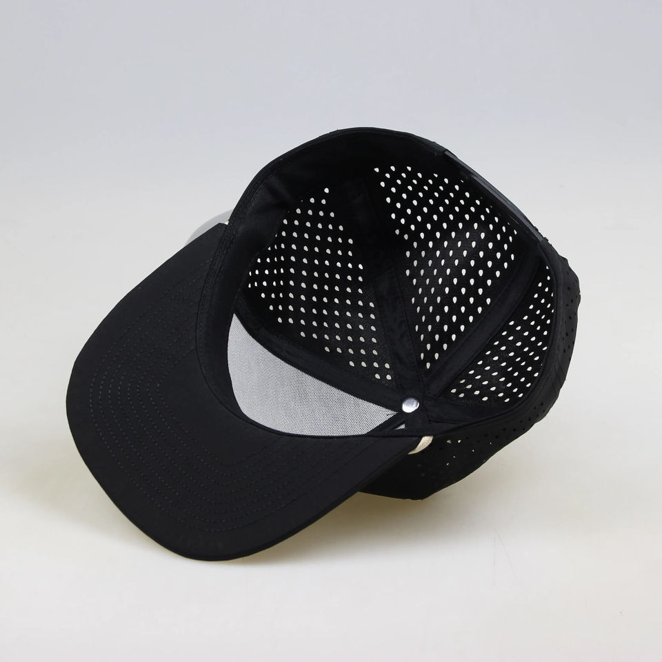 Oem Custom Mens 5Panel Laser Cut Hole Snap Back Quick Dry Black 3D Embroidery Logo Waterproof Snapback Rope Hat