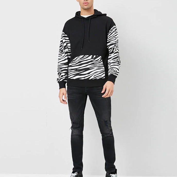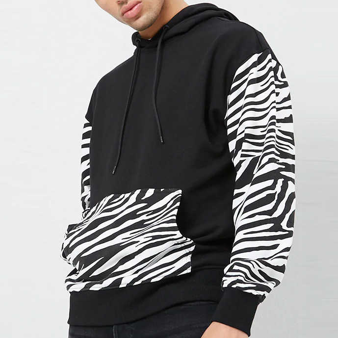 Oem Custom Sustainable Thin French Terry Quality Hoodie Leopard Printed Pocket Sleeves Plain Black Fitted Hoodies Unisex