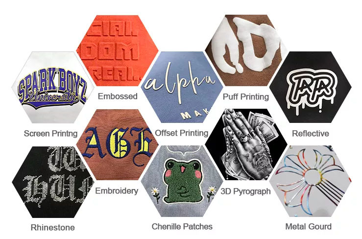 Technics:Patchwork, acid wash, Automated cutting, Beaded, Nail bead embroidery, GARMENT DYED, Plain Dyed, Printed, Tie Dyed, Washed, Yarn Dyed, Dip Dye, Batik print, Flocking embroidery, sequin embroidery, 3D embroidery, Maching embroidery/Automated embroidery, Hand Embroidery, Stonewashed, Rhinestone, Chain embroidery, towel embroidery, Applique, plain embroidery