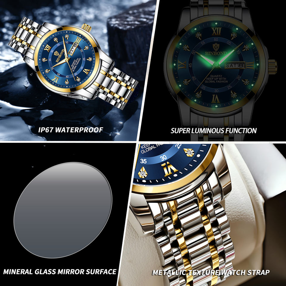 Oem Odm Binbond 7169 Quartz Movement 30M Water Resistant Luminous Business Fashion Double Calendar Diamond-studded Watch