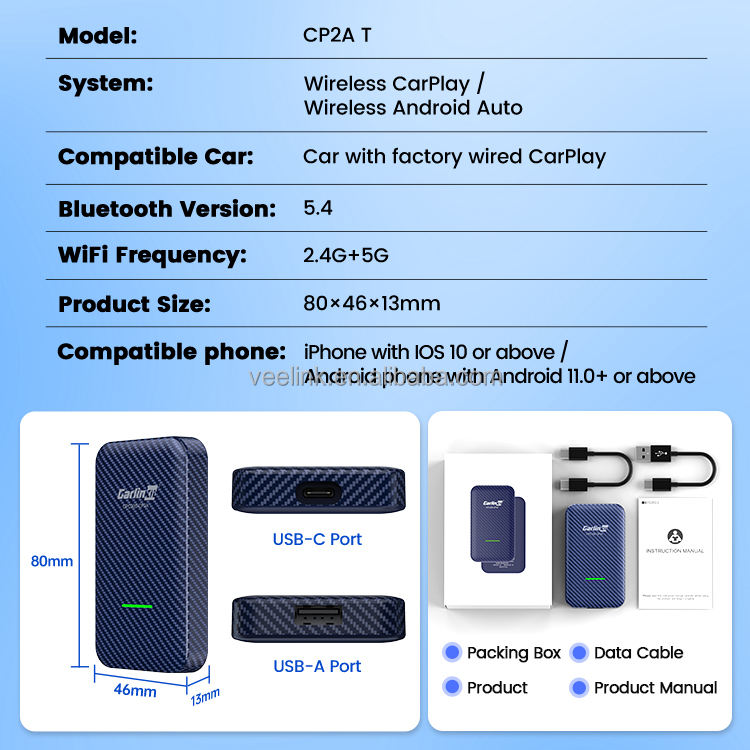 Oem Odm New Carlink Kit Cp2a-t Wireless Carplay Module Dual Channel AI Box Car Play Dongle Universal Android Auto Adapter Appl