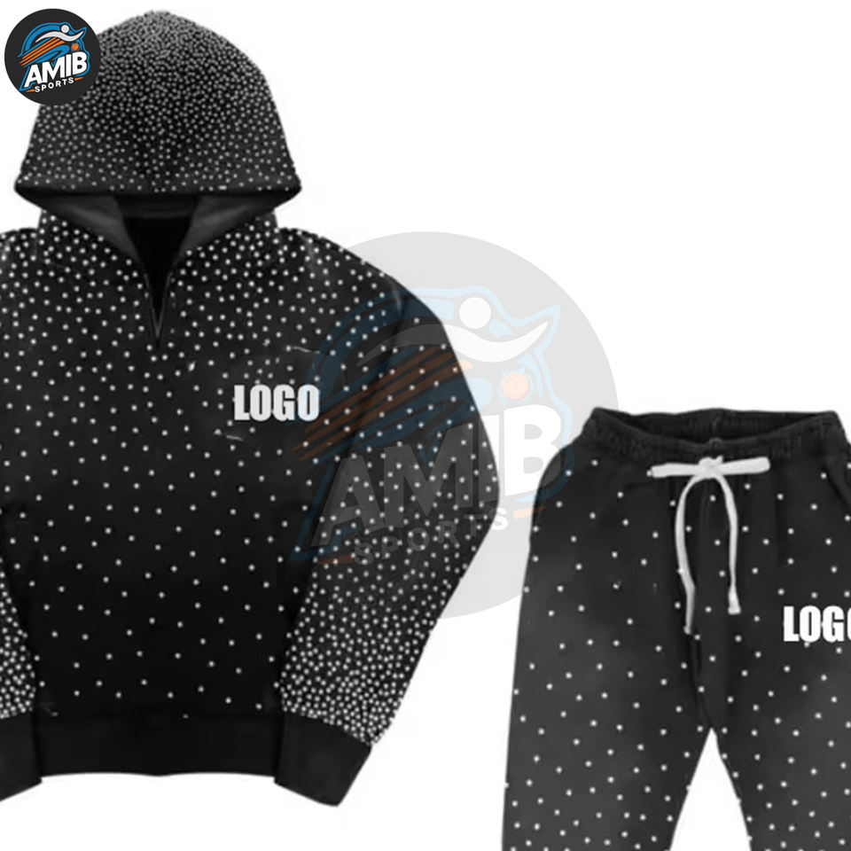 Oem Service Breathable Solid Rhinestone Men Tracksuits Cotton Polyester Long Sleeve Printed Pullover Men Rhinestone Tracksuits